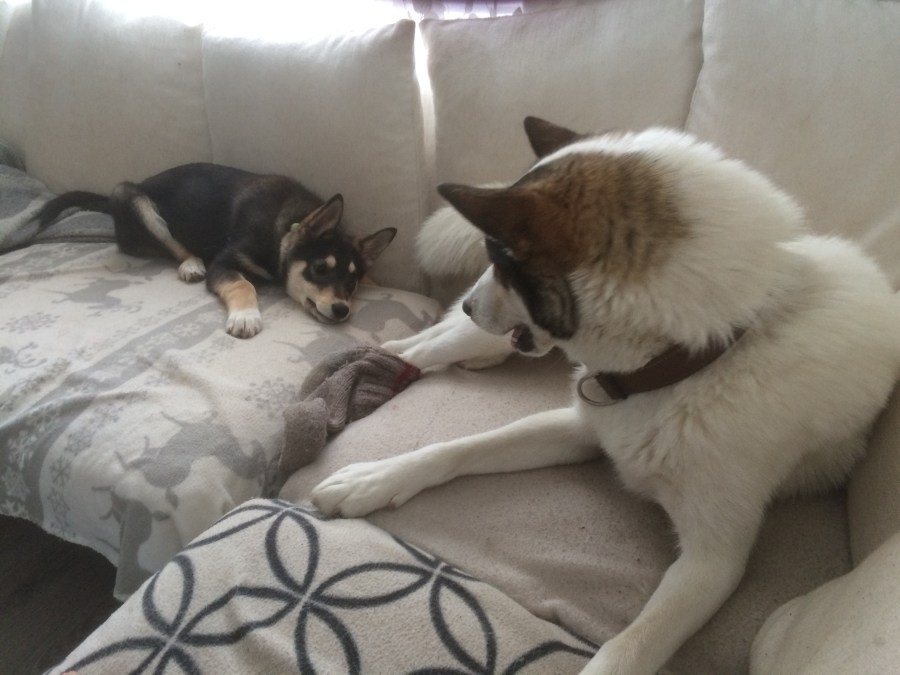 Kuten muutamista vihjeistä on voinut päätellä, koiramme ovat väritykseltään kuin yö ja päivä: Valkko lähestulkoon koko-valkea (päässä tummaa väritystä), Orasta valkeaa löytyy hieman rinnasta sekä vatsasta. Joten onkin mielenkiintoista tietää mistä nämä värit oikein tulevat. Jos oikein innostuu ja se ajankohtaiseksi tulisi, niin näiden perusteellahan voisi tehdä valistuneen veikkauksen myös minkävärisiä edustajia mahdolliseen yhdistelmäpentueeseen tulisi. …