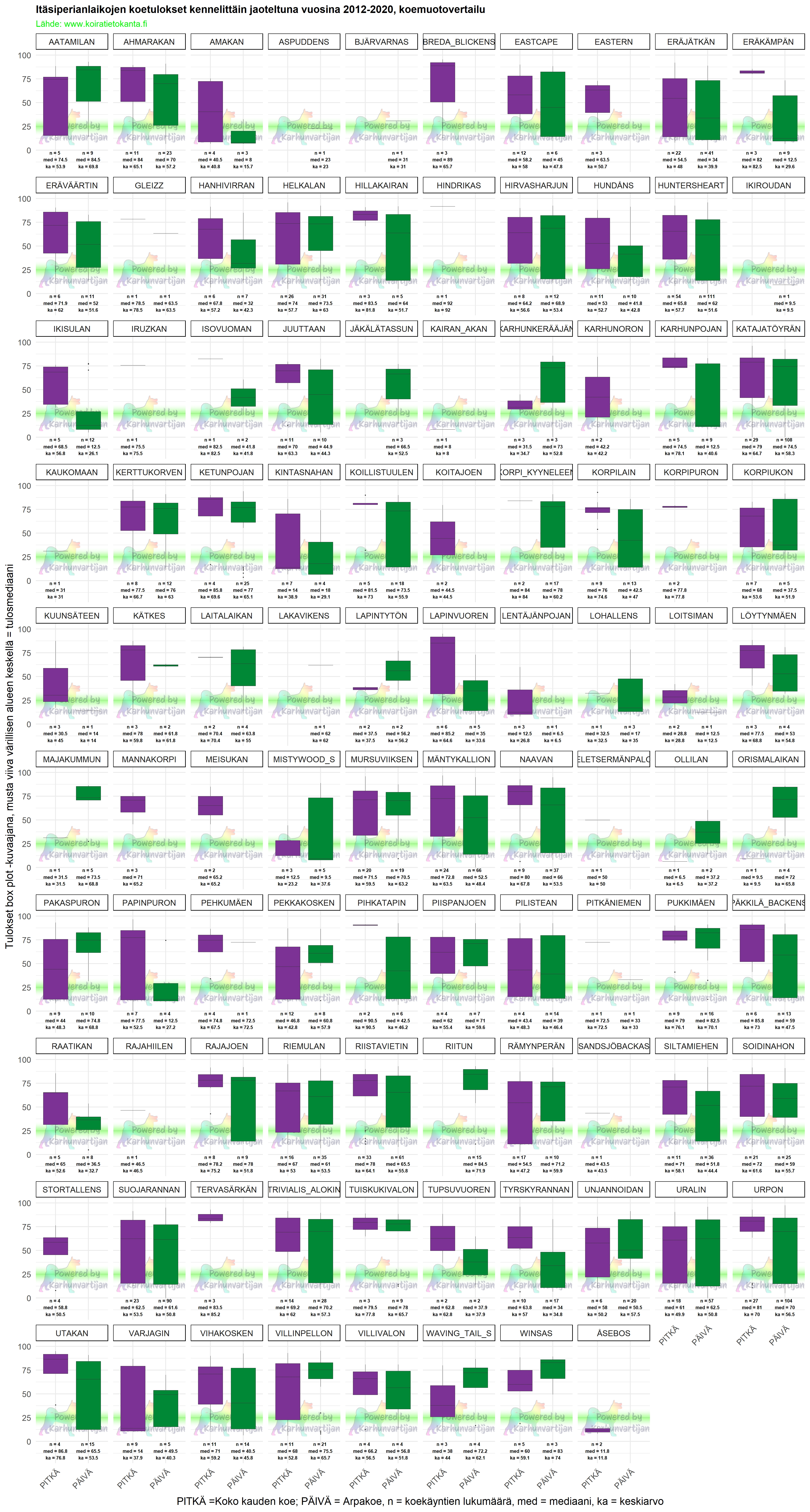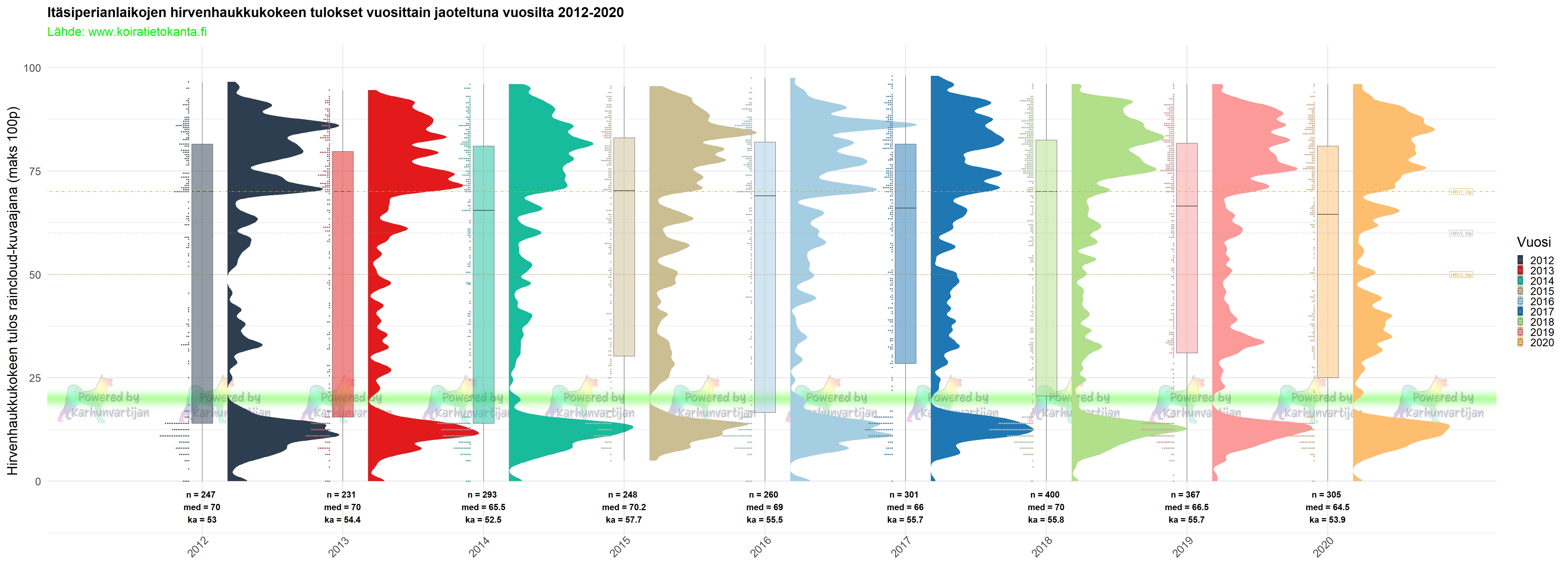 Onko itäsiperianlaikojen hirvenhaukkukokeiden ”taso” muuttunut vuosien saatossa? Koska tarkasteluun käytettävä materiaali on vain vuosilta 2012-2020, on hankalaa mennä sanomaan että onko jotain radikaalia tapahtunut. Ehkä enemmänkin on nähtävissä vaihtelua yleisesti kokeissa käymisen määrässä kuin niinkään tulostasojen jakaantumisessa. Alla olevasta Raincloud-kuvaajasta sama kuvalla havainnollistettuna. Ja linkistä kuva isompana