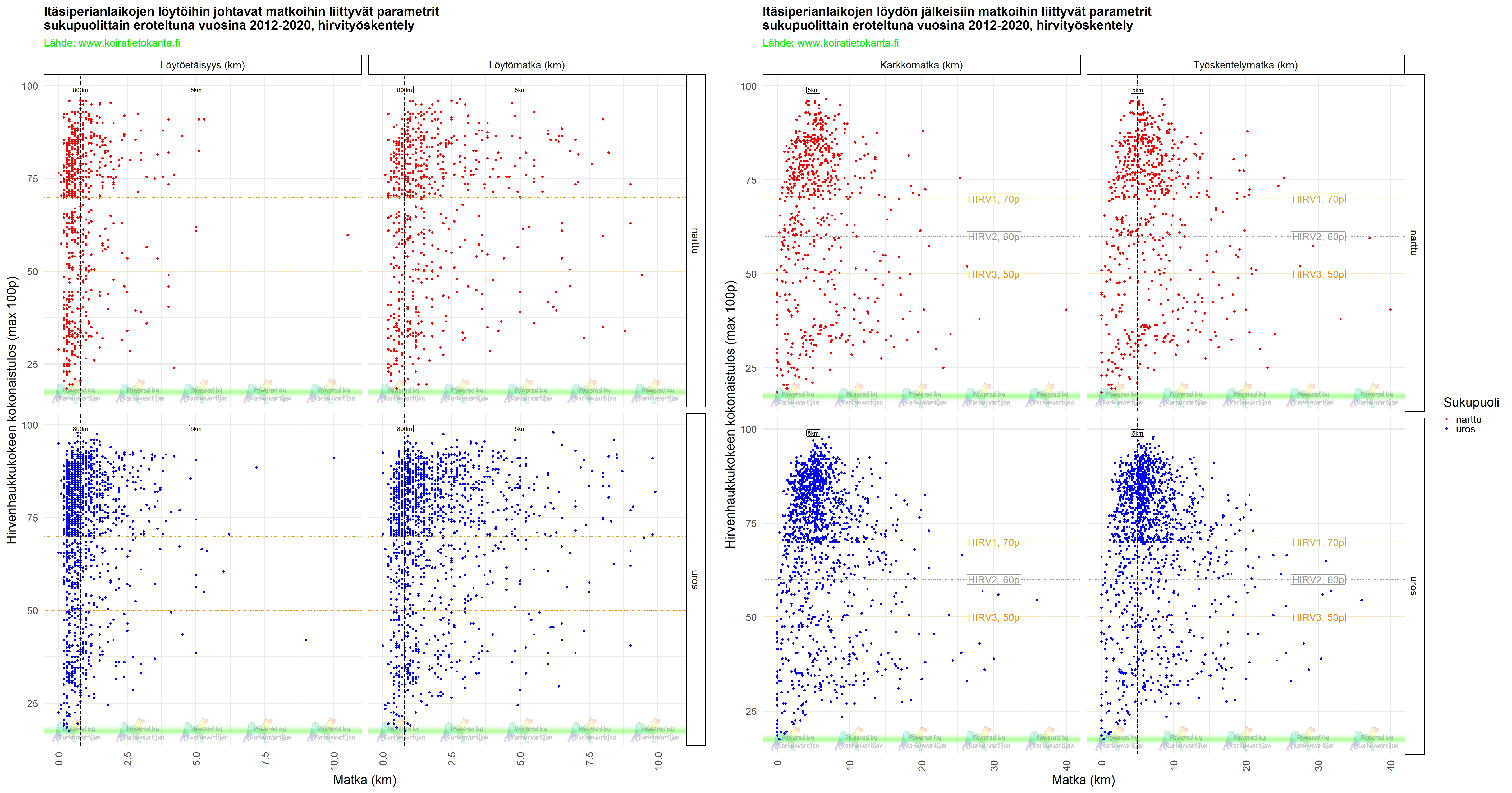 Seuraavaksi toki olisi mielenkiintoista nähdä, että onko koirien hirvityöskentelyissä sukupuolella väliä? (Oheisesta linkistä alla oleva kuvaaja suurempana).
