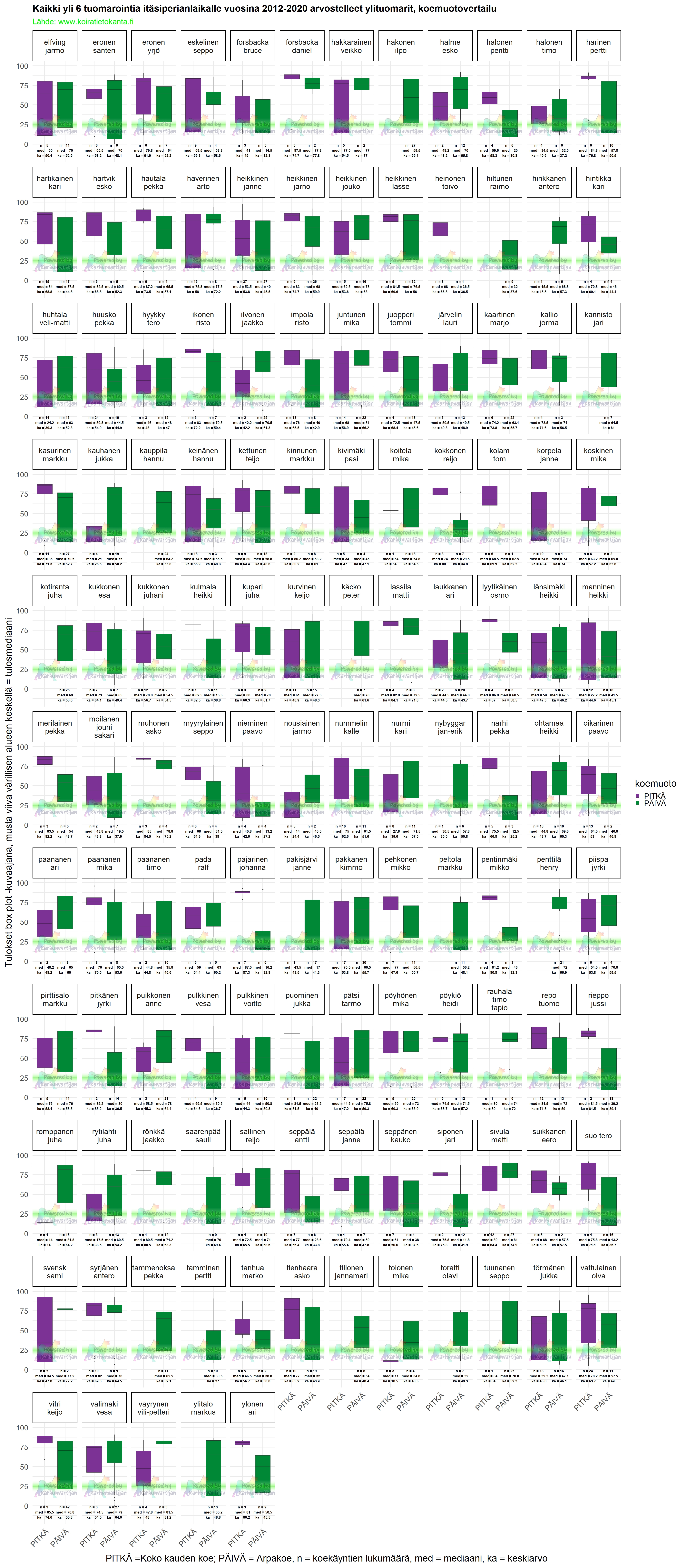 Kun datanikkarointitaidot kehittyy, niin yläpuolisen ”box plot” -kuvaajan ohella on olemassa ns. ”raincloud”-tyylisiä kuvaajia, joista tulostihentymien havainnointi on vieläkin helpompaa. Koska yli 6 tuomarointeja vuosien 2012-2020 aikana tehneitä tuomareita on melkoinen määrä, alla oleva kuvaaja on pienenä yhtä hyödyllinen kuin simpukka vessassa (jonnet ei muista). Mutta oheisen linkin takaa kuvaajaa pitäisi päästä jo tihrustamaan luettavassa koossa.