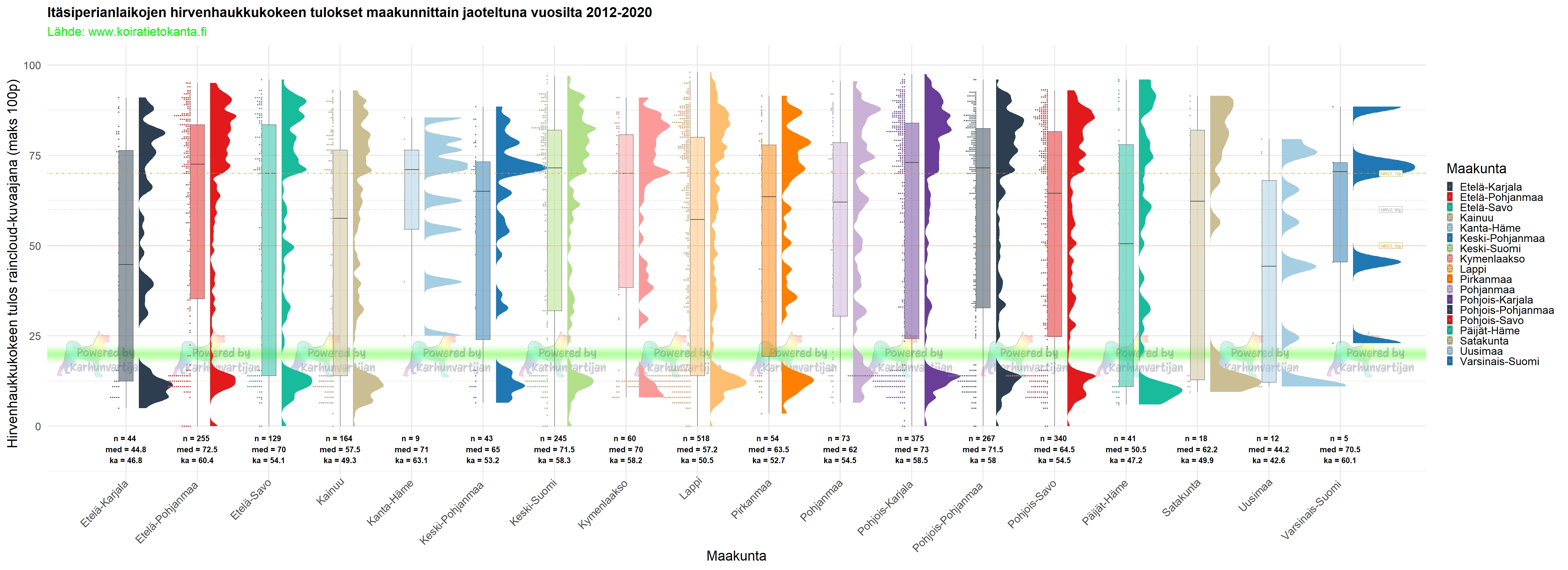 Onko itäsiperianlaikojen hirvenhaukkukokeiden ”taso” muuttunut vuosien saatossa? Koska tarkasteluun käytettävä materiaali on vain vuosilta 2012-2020, on hankalaa mennä sanomaan että onko jotain radikaalia tapahtunut. Ehkä enemmänkin on nähtävissä vaihtelua yleisesti kokeissa käymisen määrässä kuin niinkään tulostasojen jakaantumisessa. Alla olevasta Raincloud-kuvaajasta sama kuvalla havainnollistettuna. Ja linkistä kuva isompana