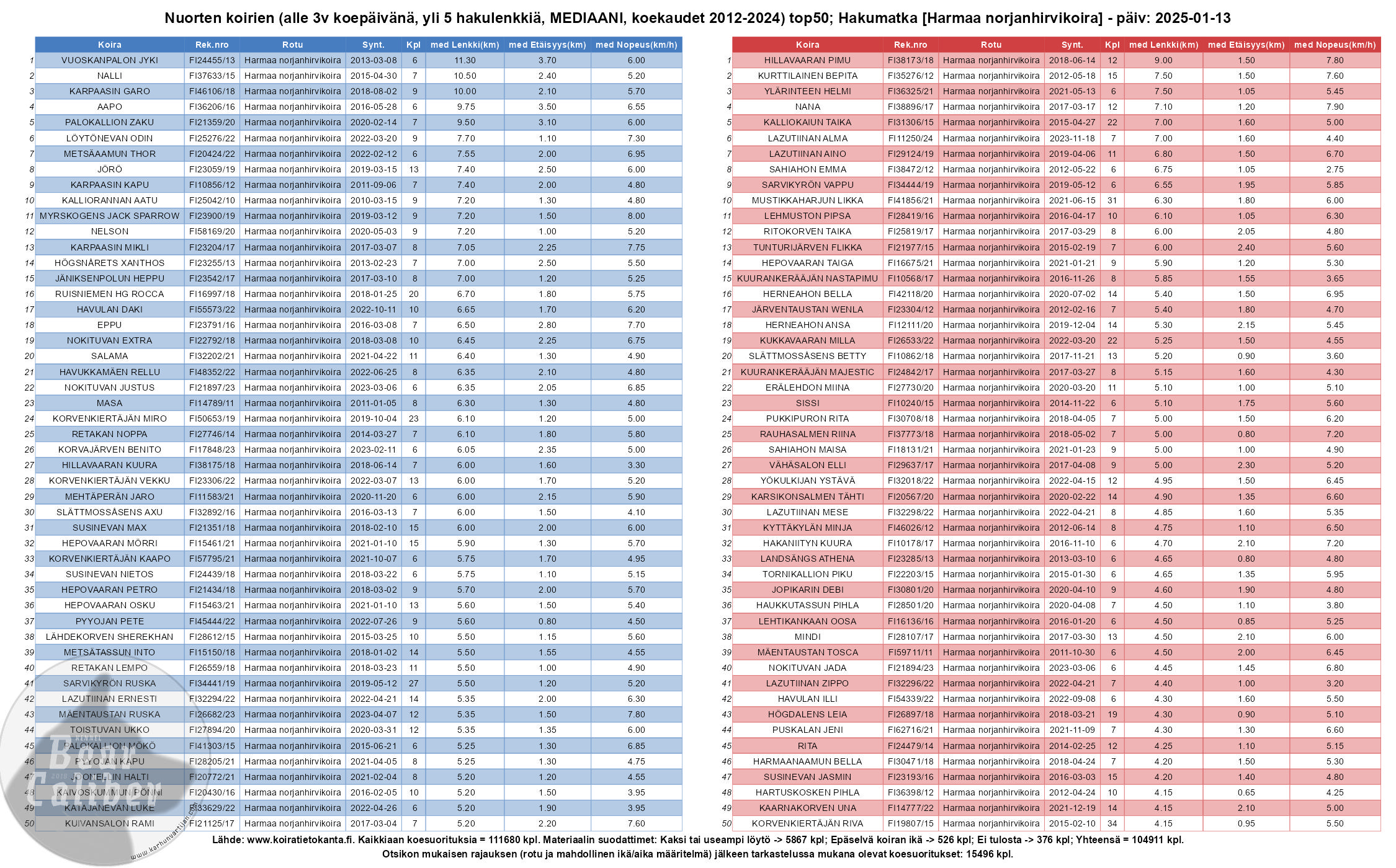 Taulukkojärjestys: Ensin kaikki (koekaudet 2012-2024), toisena nuorten koirien (koira alle 3v koepäivänä) ja kolmantena kuluvan koekauden (2024) koesuoritukset sukupuolittain eroteltuna. Tarkastelussa mukana vain koirat joilla vähintään 6 tai enemmän arvosteltua hakulenkkiä yhdestä tai useammasta hirvenhaukkukokeesta (pl. kuluva koekausi, jossa kaikki arvostelut ovat mukana taulukoinnissa).