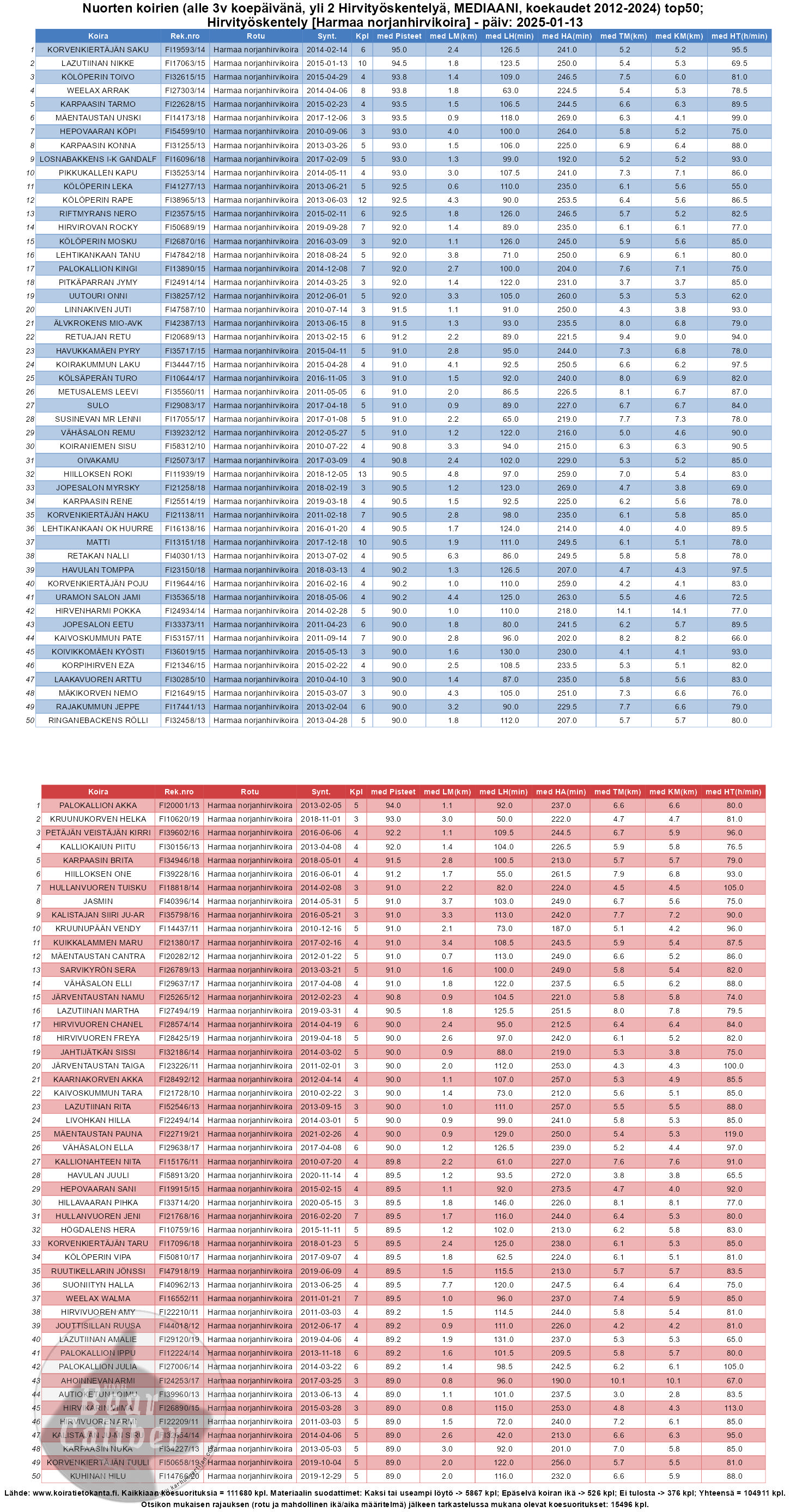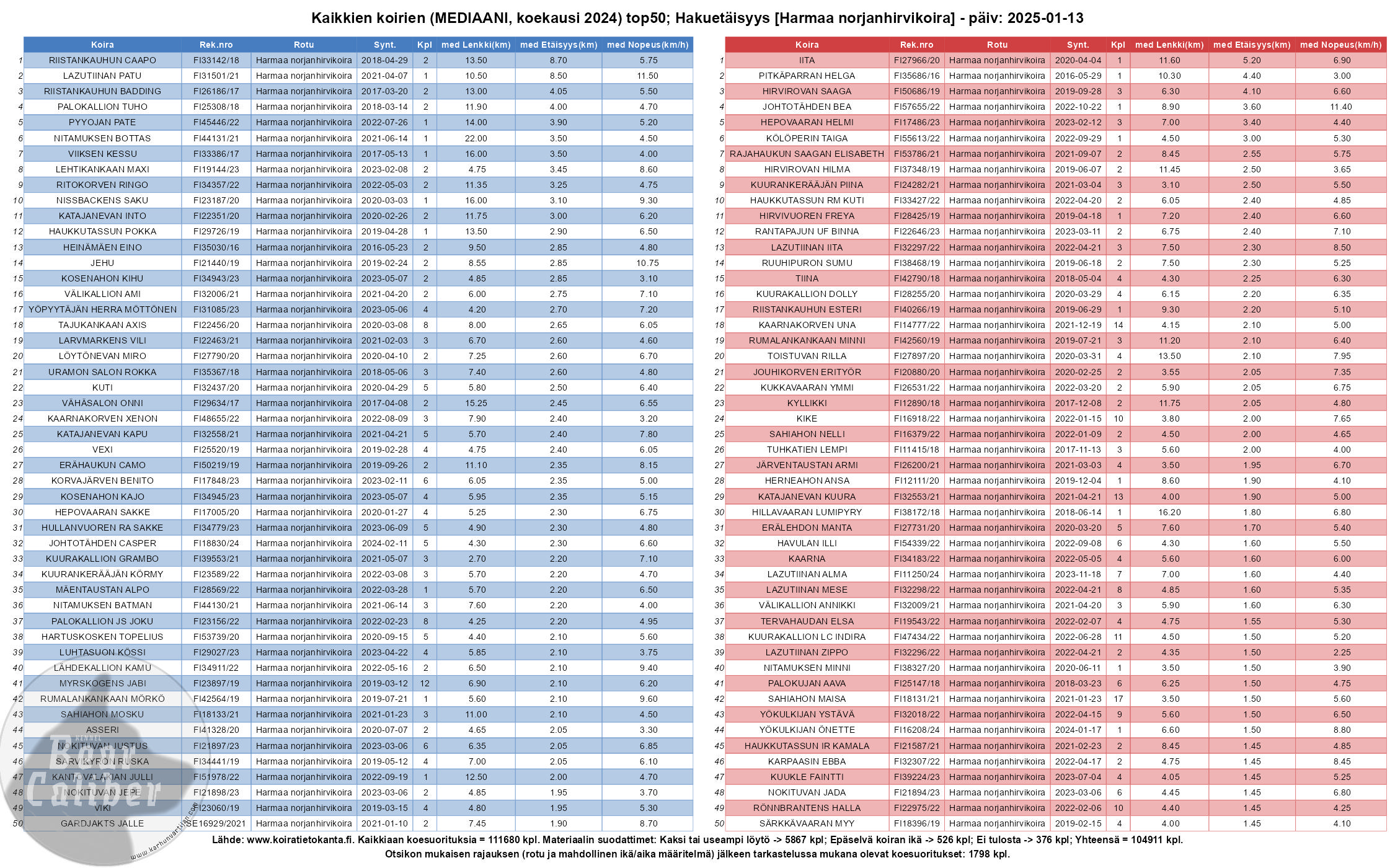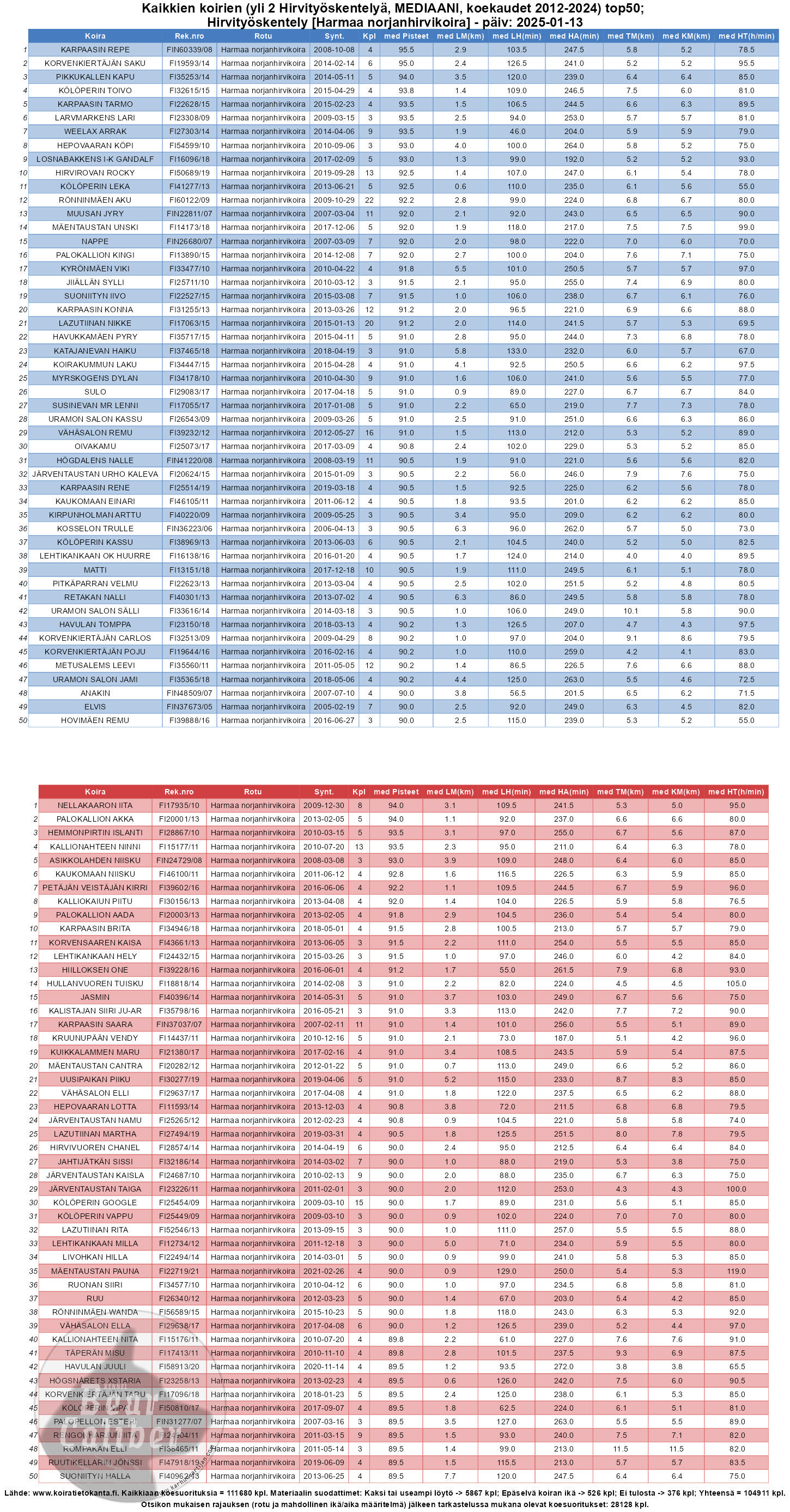 Tiivistämisen vuoksi oheiseen taulukkoon on koottu loppupiste-mediaanin osalta TOP50-harmaat norjanhirvikoirat. Koska pelkkä loppupisteisiin tuijottaminen on hieman tylsää, niin rinnalle on koottu mediaanituloksia eri hirvityöskentelyn osa-alueista. Näin tiedon tulkitsijat voivat päätellä minkälaisella työskentelyllä yleensä hyviä pisteitä saadaan.