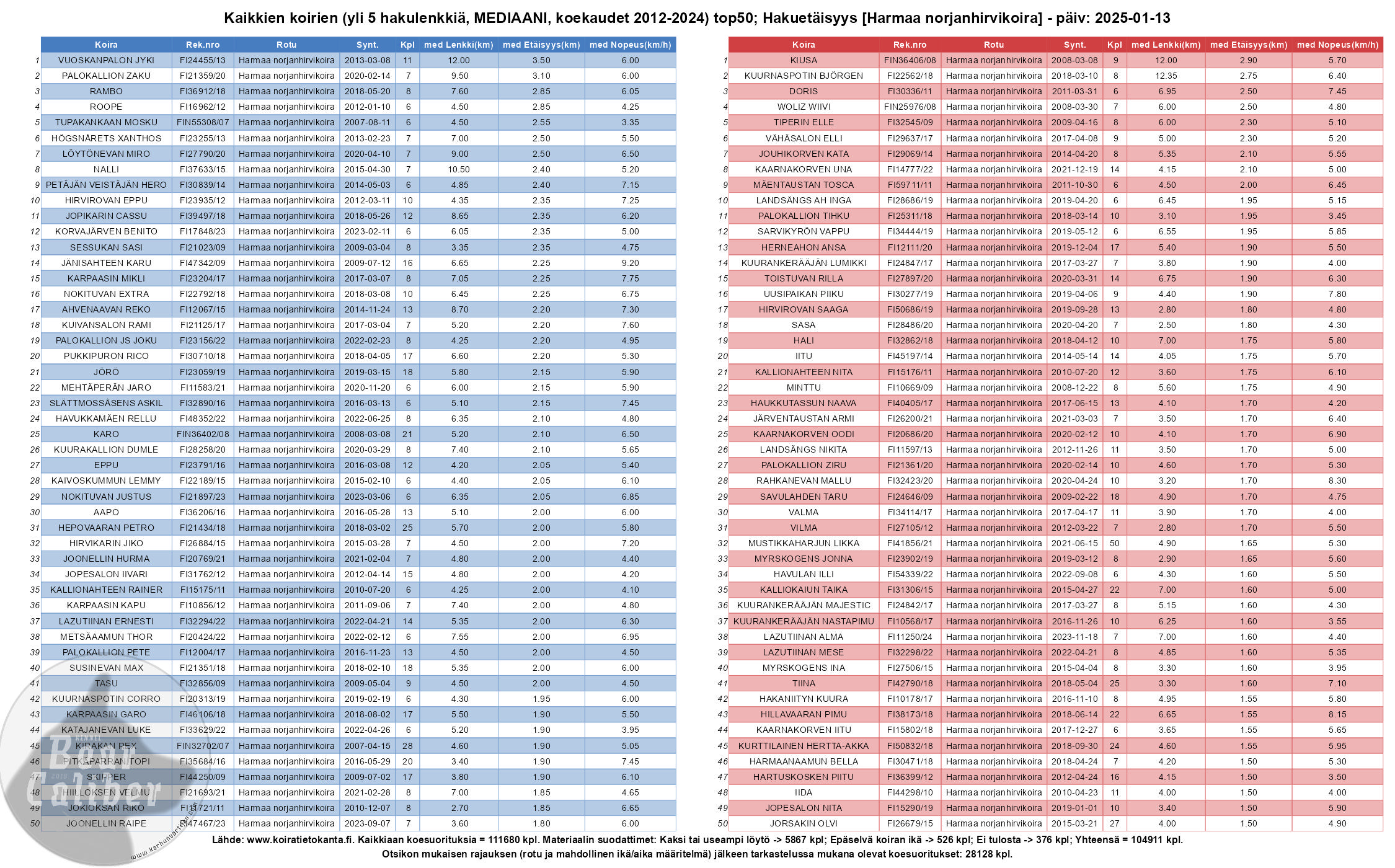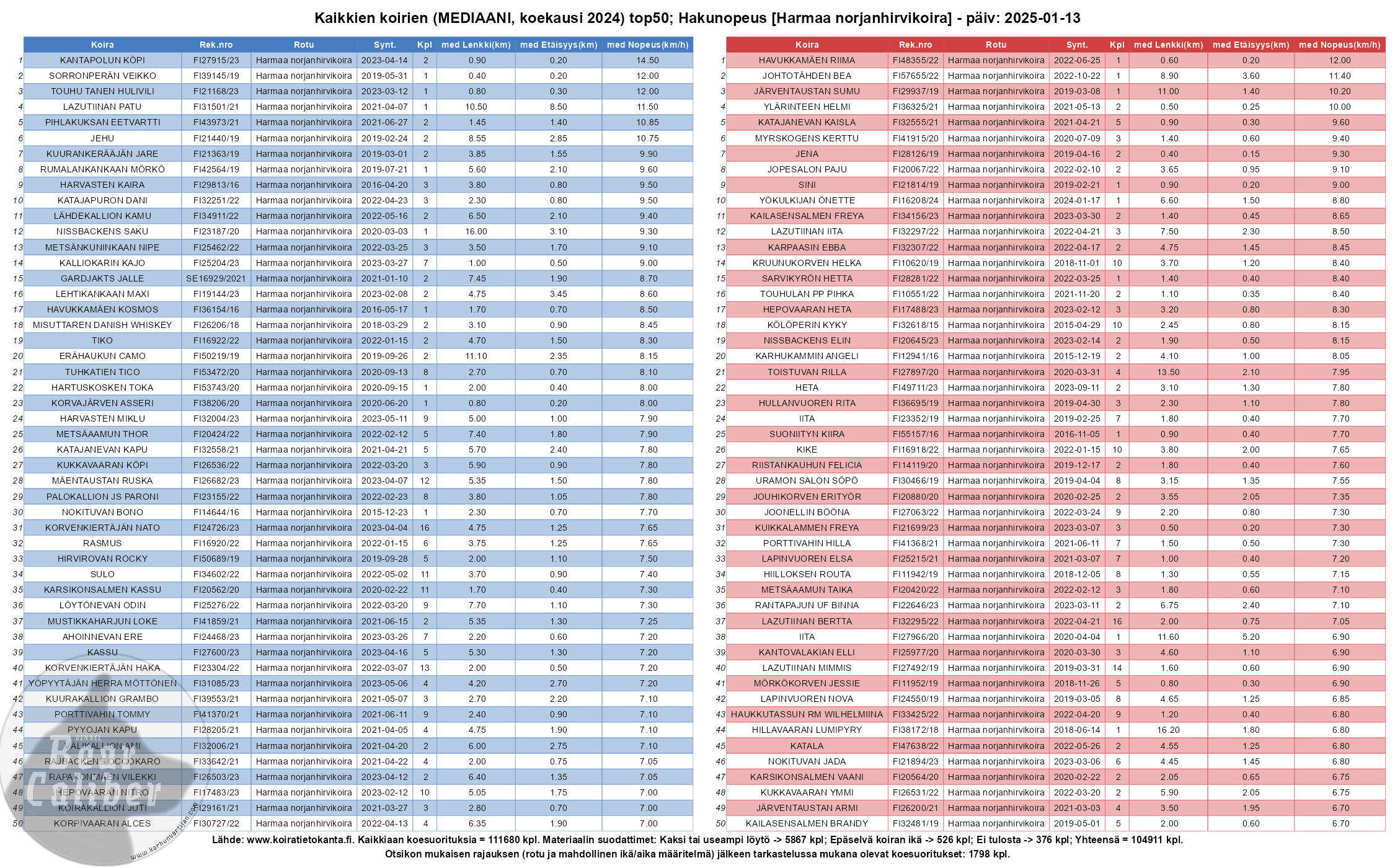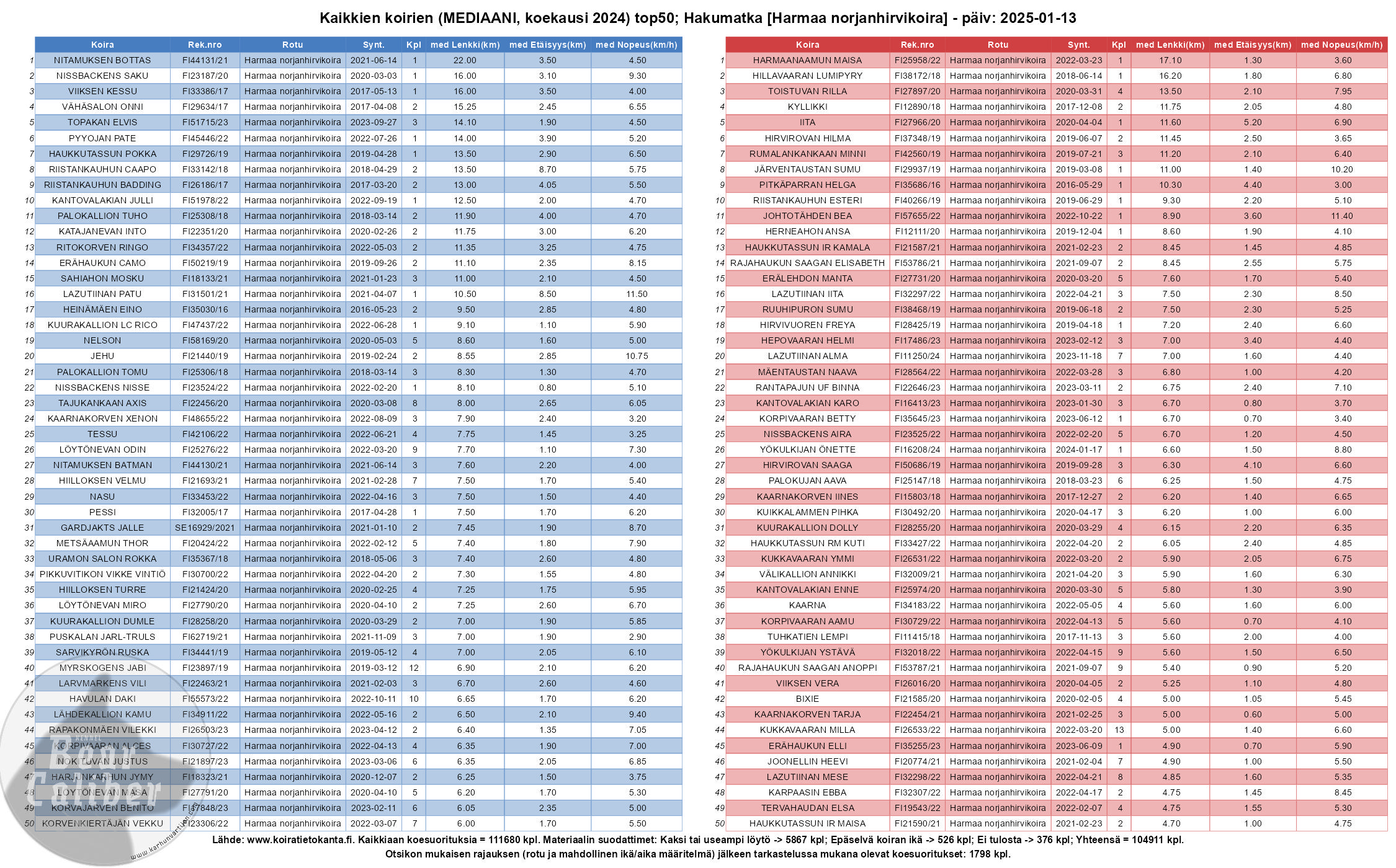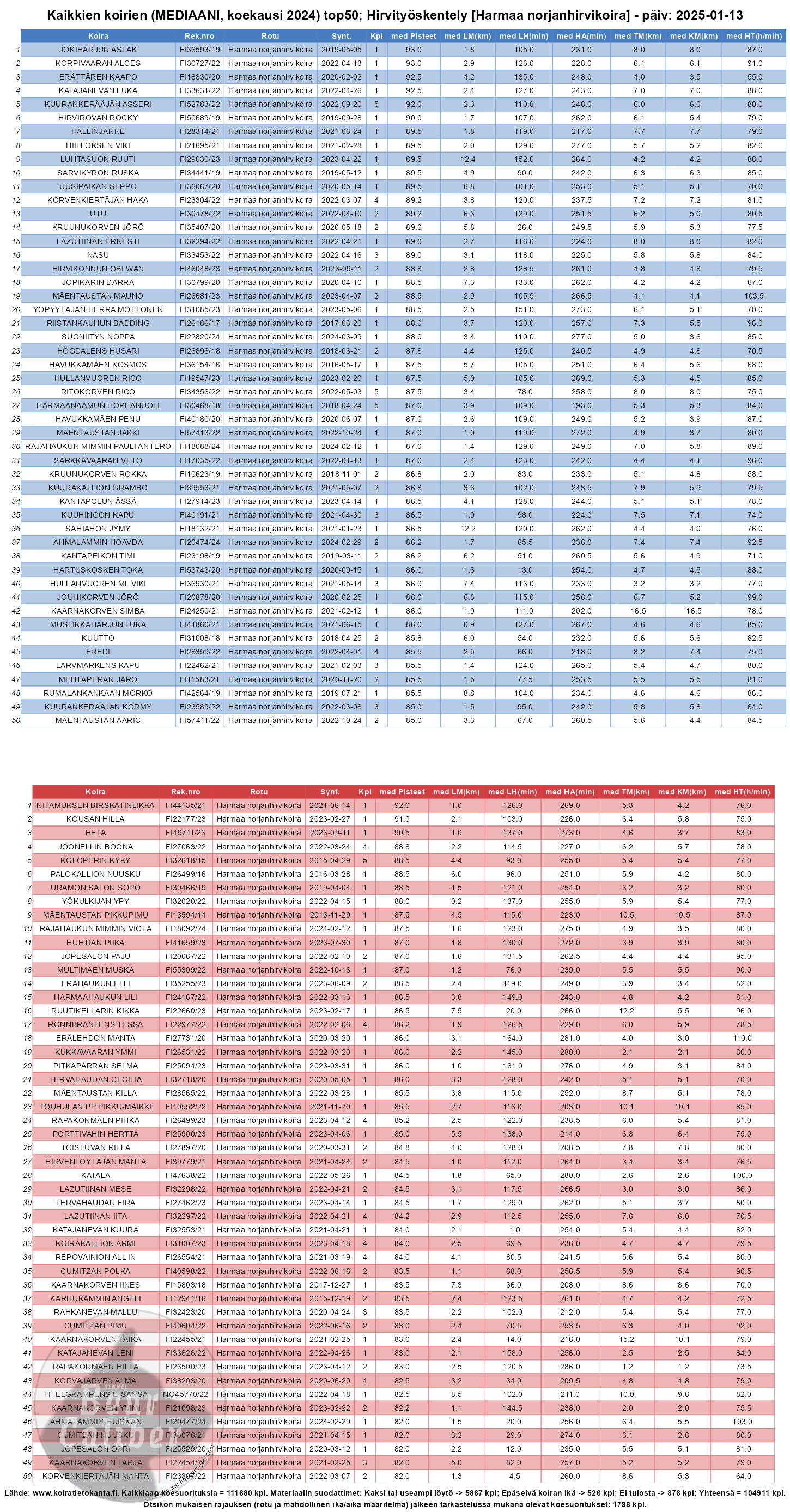 Tiivistämisen vuoksi oheiseen taulukkoon on koottu loppupiste-mediaanin osalta TOP50-harmaat norjanhirvikoirat. Koska pelkkä loppupisteisiin tuijottaminen on hieman tylsää, niin rinnalle on koottu mediaanituloksia eri hirvityöskentelyn osa-alueista. Näin tiedon tulkitsijat voivat päätellä minkälaisella työskentelyllä yleensä hyviä pisteitä saadaan.