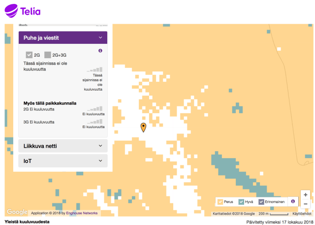 Eli summa summarum, käytä 2G:tä, et sie mitään voita 3G:ssä tarpoessa (Lapissa). Nonniin, ja entäs sitten? Niin, Suprallehan myö tehdään G500:set, eli pakotetaan se itkien ja vinkuen käyttämään *vain* 2G:tä. Ensimmäisenä materiaalia hienosta metsäpäivästä 22.10.2018 seuraavanlaisella kuuluvuusalueella (by Telia) [eihän noilla ole taaskaan mitään eroa, onko 2G vai 3G tuolla alueella]