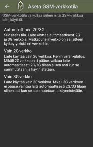 Tämä reissu se tosiaan jo koetteli Anun hermoja, ja oltiin jo lompimassa vaihtamaan Supraa pois. Vaan sitten Trackerin asiakaspalvelu osasi jakonimen avulla kertoa että Supra pysyy kynsin ja hampain kiinni 3G-verkossa (turhaan), joten kannattaa vaihtaa GSM-verkon asetukset oheisesti: